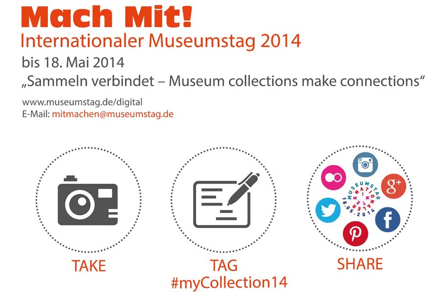 Dieses Jahr dreht sich alles um das Thema „Collection / Sammlung“ und um Fotos. Machen Sie mit und posten auf Twitter, Facebook, Instagram etc. unter dem Hashtag #IMT14 und/oder #myCollection14 ihre Fotos zum Thema „Sammlung". Ob Fotos aus der eigenen Sammlung, Aufnahmen einzelner Museumsobjekte oder besonderer Momente im Museum, Motive zur Arbeit hinter den Kulissen oder auch „Museumselfies“ (also Selbstporträts im Museum), der Kreativität sind keine Grenzen gesetzt.