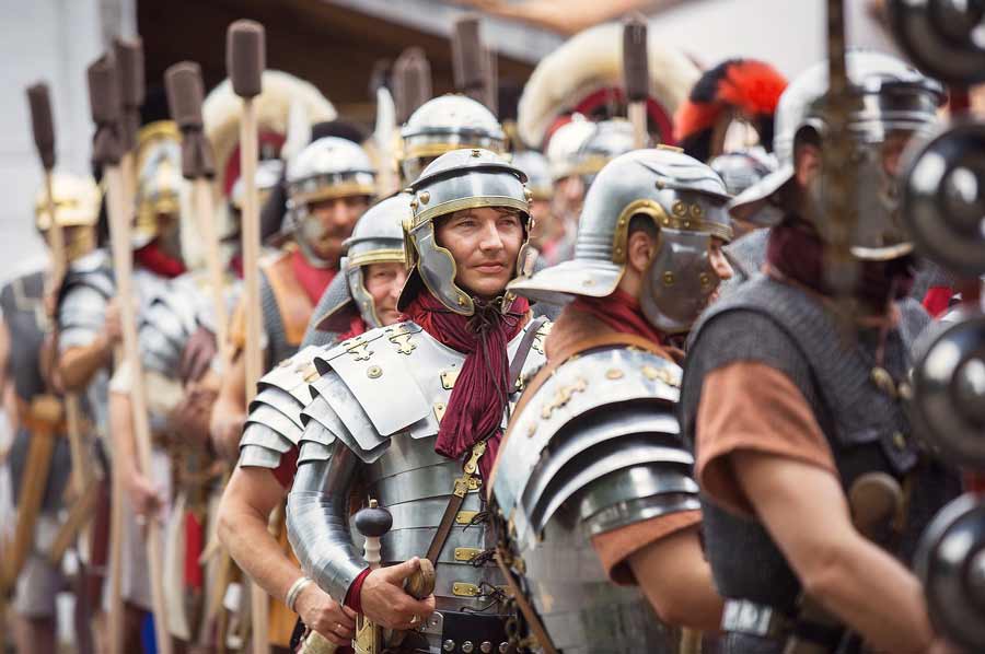 Auf der Römerstraße durchs Jahr 2020 Auch dieses Jahr laden zahlreiche Veranstaltungen und Aktionen entlang der Strecke dazu ein, sich mit unserer römischen Vergangenheit zu befassen und sie teils hautnah zu erleben. Große Römerfeste in Vindonissa (Brugg/Windisch im Aargau), auf dem Gelände des Freilichtmuseums Villa Rustica in Hechingen-Stein sowie an der Römischen Bad Ruine in Hüfingen bieten Geschichte zum Anfassen. Da werden Schwerter geschmiedet und Kleidung gewebt, da wird gekocht und gegessen, da wird aber auch gekämpft – seien es Gladiatoren in der Arena oder Legionäre, die gegen Alamannen und Kelten antreten.