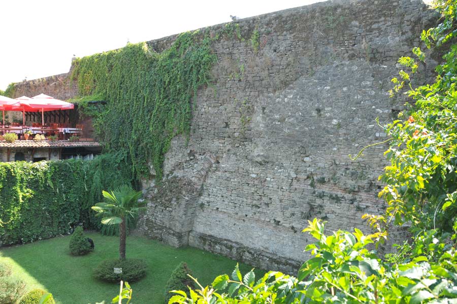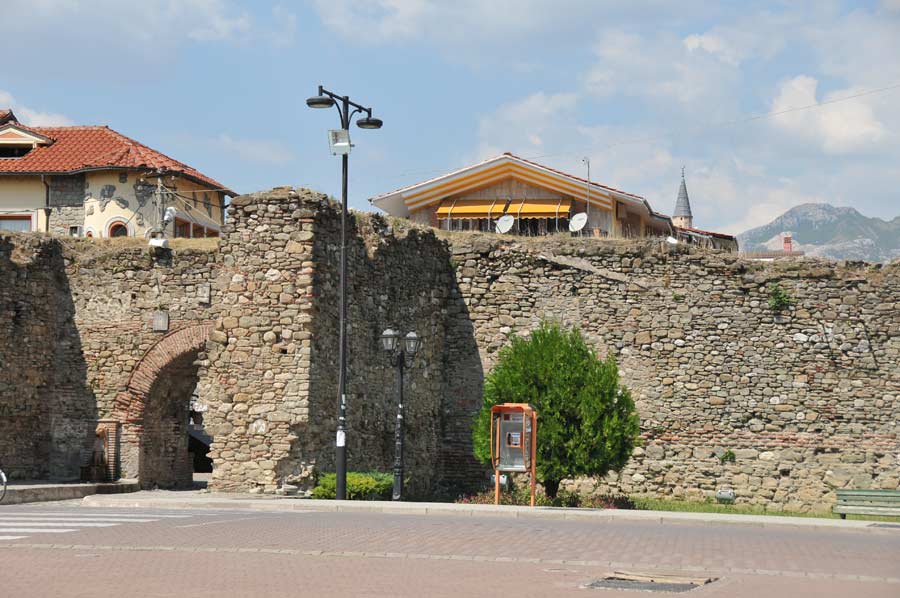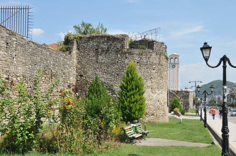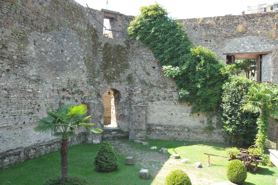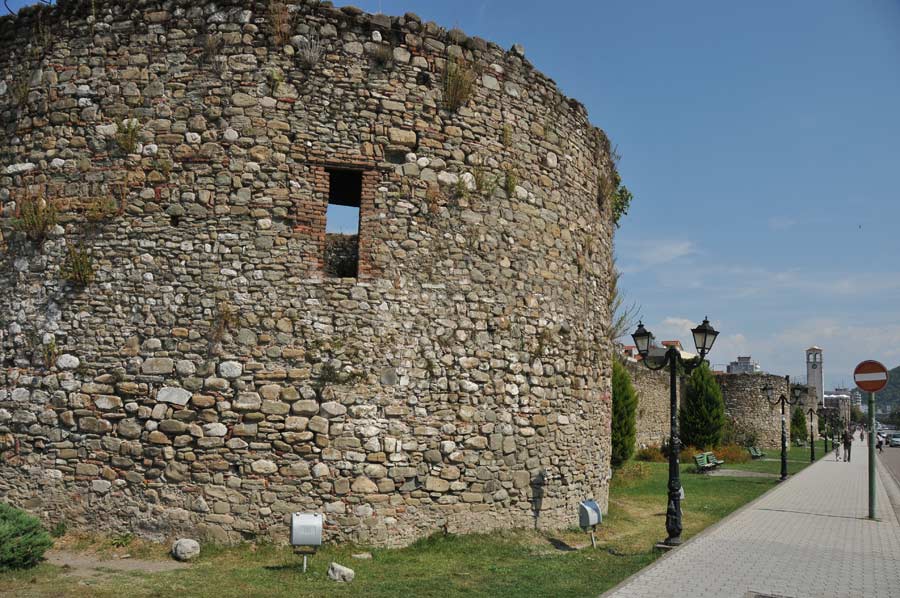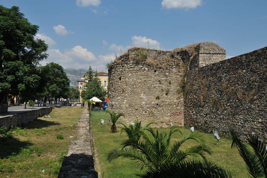 Scampa wurde von den Römern Anfang des 4. Jahrhunderts zu einer Festung (Castrum) ausgebaut, die Lage des Mauerrechtecks von 348 Meter auf 308 Meter bildet bis heute die Grenze der Altstadt. Die Via Egnatia verlief durch die beiden in der Mitte der West- und Ostseite gelegenen Stadttore. Ein Nebentor zum Fluss befand sich im Süden. Die einstige Stadtmauer mit elf Metern Höhe wurde durch 26 regelmäßig angeordnete und aus der Wand hervorspringende Türme verstärkt. Von der Stadtmauer ist praktisch nur noch der südliche Teil mit dem einstigen Nebentor erhalten.