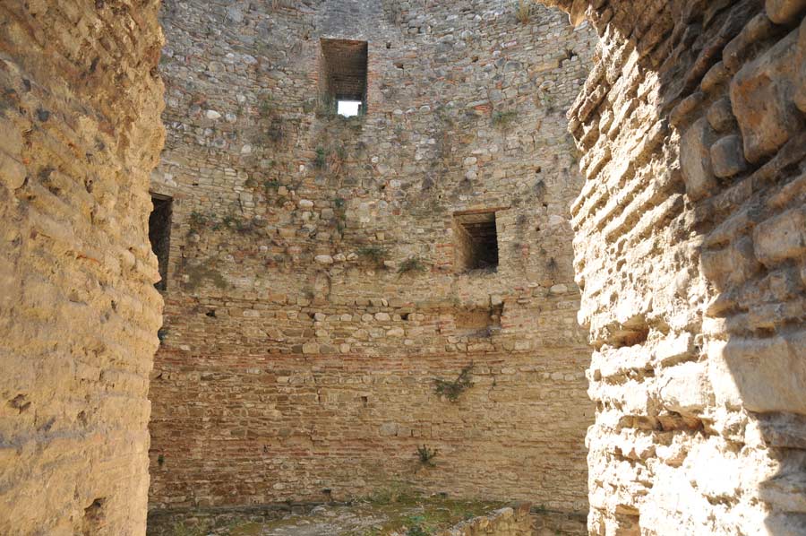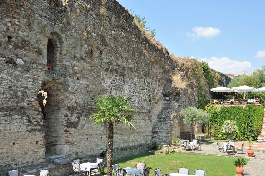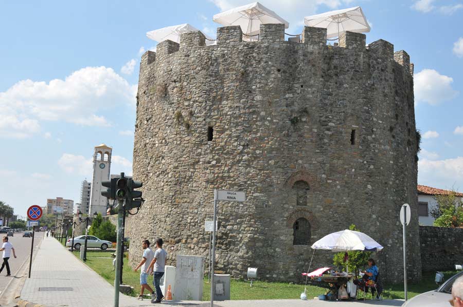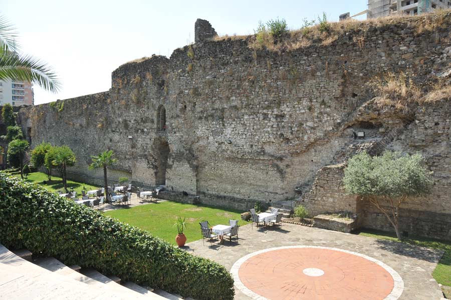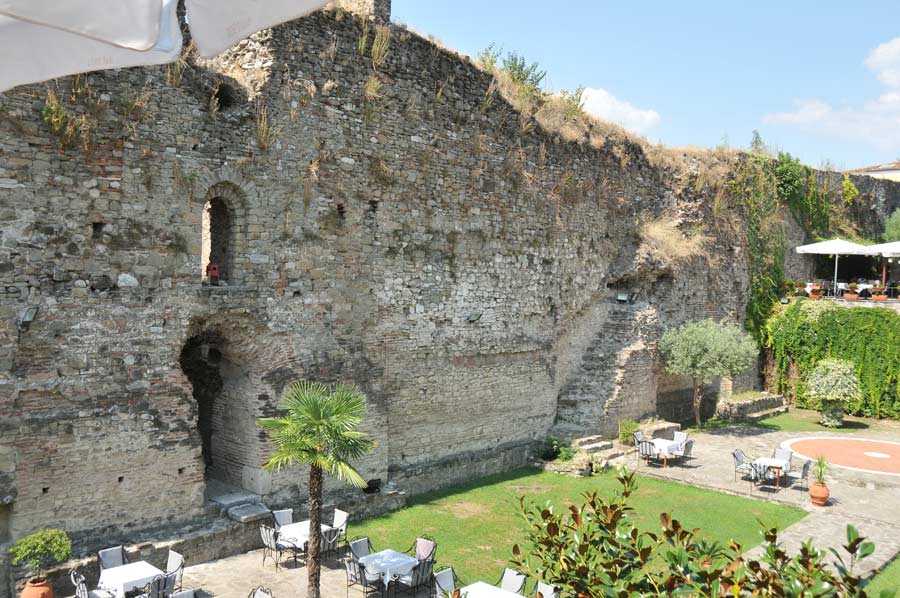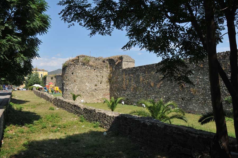 Scampa wurde von den Römern Anfang des 4. Jahrhunderts zu einer Festung (Castrum) ausgebaut, die Lage des Mauerrechtecks von 348 Meter auf 308 Meter bildet bis heute die Grenze der Altstadt. Die Via Egnatia verlief durch die beiden in der Mitte der West- und Ostseite gelegenen Stadttore. Ein Nebentor zum Fluss befand sich im Süden. Die einstige Stadtmauer mit elf Metern Höhe wurde durch 26 regelmäßig angeordnete und aus der Wand hervorspringende Türme verstärkt. Von der Stadtmauer ist praktisch nur noch der südliche Teil mit dem einstigen Nebentor erhalten.