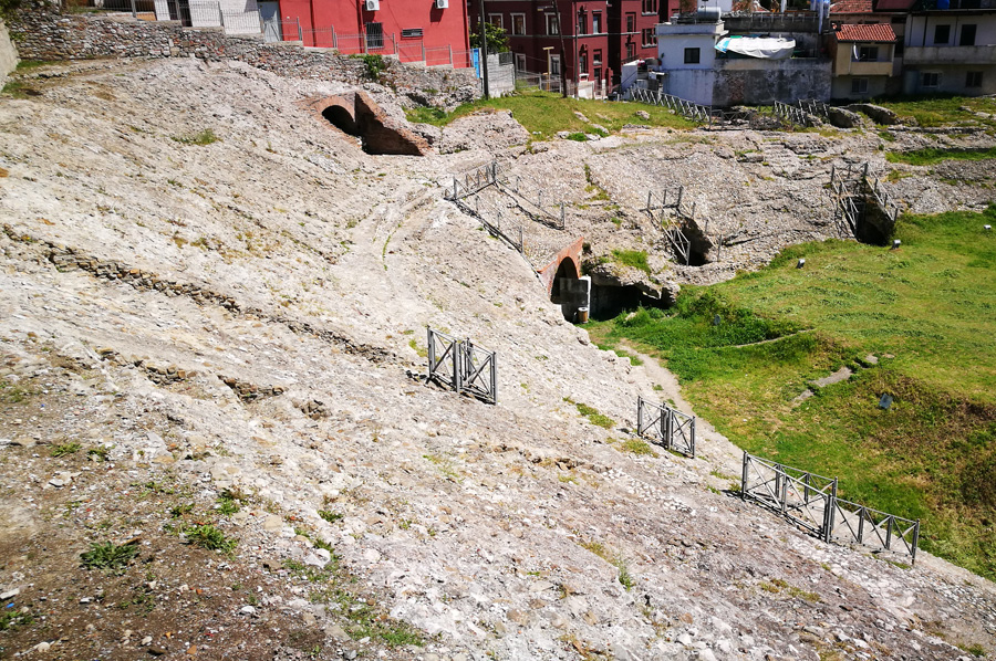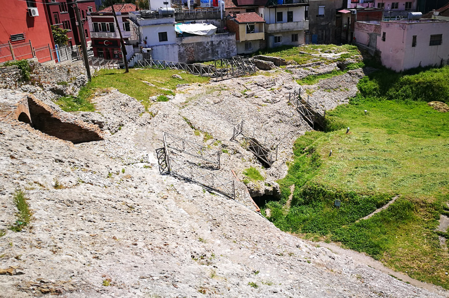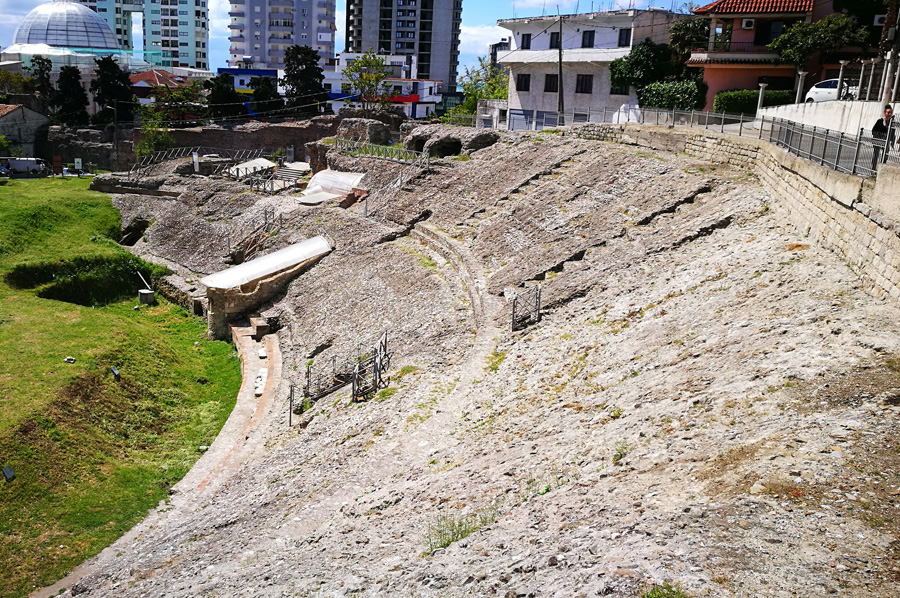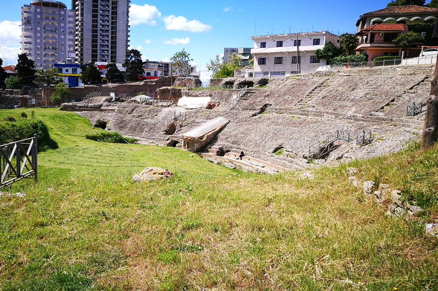 Aus römischer Zeit (vermutlich erste Hälfte des 2. Jahrhunderts n. Chr.) stammt denn auch das Amphitheater, das Platz für gut 15.000 Leute bot. Es misst 127 auf 103 Meter, die Arena 63 auf 39 Meter. Es wurde erst 1966 entdeckt und freigelegt. Da die antike Siedlung genau unter der heutigen Stadt liegt, sind erst wenige antike Überreste freigelegt worden. Das Amphitheater und die unterirdischen Gänge können besucht werden, ein Großteil der Fundstücke befindet sich im wirklich sehenswerten Museum von Durrës.