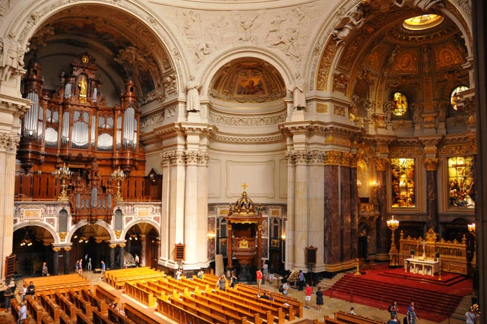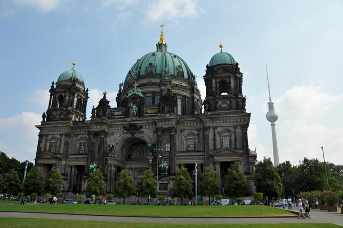 Der Berliner Dom, der offiziell Oberpfarr- und Domkirche zu Berlin heißt, ist eine evangelische Kirche auf dem nördlichen Teil der Spreeinsel, eine der größten protestantischen Kirchen Deutschlands und die größte Kirche Berlins. Der 1894 bis 1905 nach Plänen von Julius Raschdorff in Anlehnung an die italienische Hochrenaissance und den Barock errichtete Dom gehört zu den bedeutendsten protestantischen Kirchenbauten in Deutschland. Die Gesamthöhe beträgt heute 116 Meter auf einer jetzigen Grundfläche von etwa 73 × 93 Metern (ursprünglich 73 × 114 Meter vor Abriss der Denkmalskirche). Die Kuppel hat eine Scheitelhöhe von 74,8 Metern bei einem Durchmesser von 33 Metern. Ein durchaus beeindruckendes Gebäude! Dahinter im Bild der Fernsehturm.