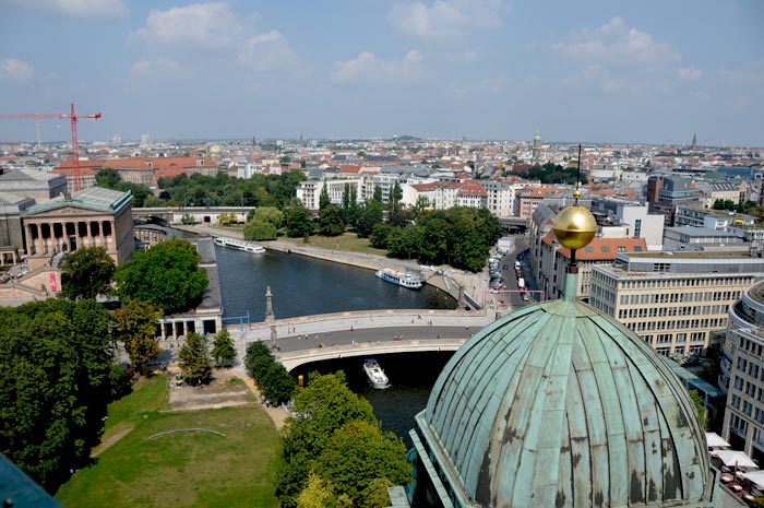 Über etliche allerdings nicht gezählte Stufen gelangt man auf die Aussichtsplattform der Domkuppel. Der Blick auf die Spree sowie die Museumsinsel ist nicht nur beeindruckend schön, sondern zeigt auch den immer noch anhaltenden massiven Bauprozess nach der Maueröffnung. Baukräne, wohin das Auge blickt.