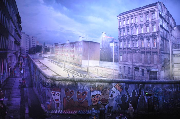 Im Verlauf unserer Reisen haben wir uns bereits einige monumentalen Werke des Bildkünstlers Assisi angesehen. Gleich neben dem Checkpoint Charlie gibt es eine weiteres 180° Bild des Künstlers, das eindrucksvoll den Blick hinter die Mauer zeigt. Fast lebensecht wird eine Situation in Personen und Gegenständen gezeigt, die den Schrecken der Mauer in seiner ganzen Tragweite zeigt.