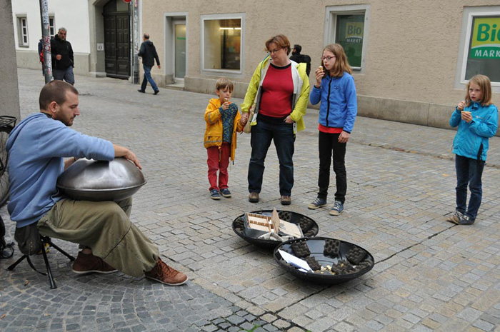 Am folgenden Freitag eröffnet Andreas Koller mit faszinierenden Tönen seiner liebevoll mit "Schüssel" bezeichneten Handpan den Tag an der Ecke des EBW-Gebäudes mit ersten Melodien. Link: Was wird der Tag bringen