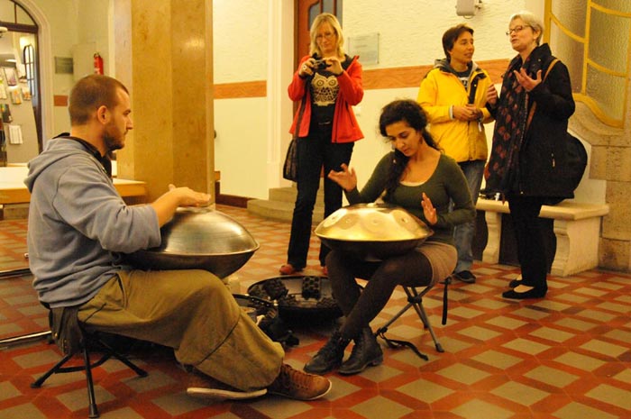 Andreas Koller hatte sich mit seiner Partnerin Fabiana Olsen im Foyer des Evangelischen Bildungswerkes niedergelassen. Egal, wo auch immer sein Auftritt an der Handpan, er war immer von faszinierten Zuhörern umgeben. Link: Andreas Koller - Strassenmusiker