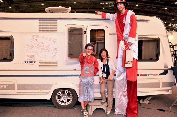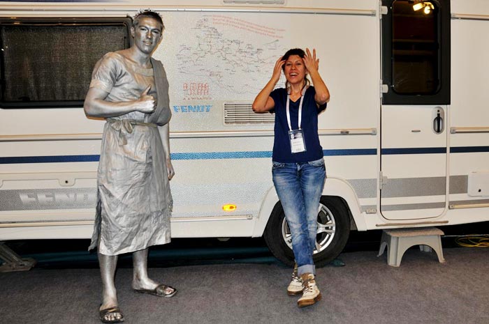 Aufgelockert wurde die Veranstaltung immer wieder durch Aufmerksamkeit erregende Künstler und Artisten, die durch die Hallen marschierten. Hier der Besuch eines Stelzengängers bei uns am Projektfahrzeug.