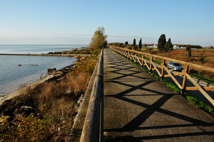 Der Fahrradweg verläuft ab hier zwar parallel zur Landstraße, aber doch getrennt davon. Von der Lagune bei Grado am Mittelmeer kann der Radwanderer die Alpen erreichen und überqueren und sich dann das Radwegenetz Österreichs und Deutschlands weiter erschließen.