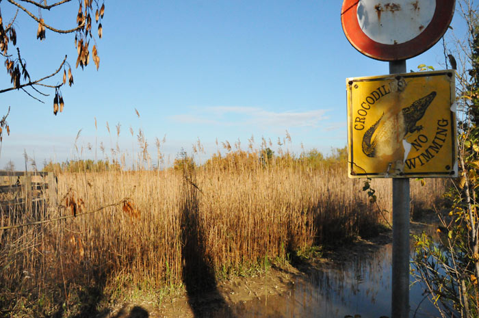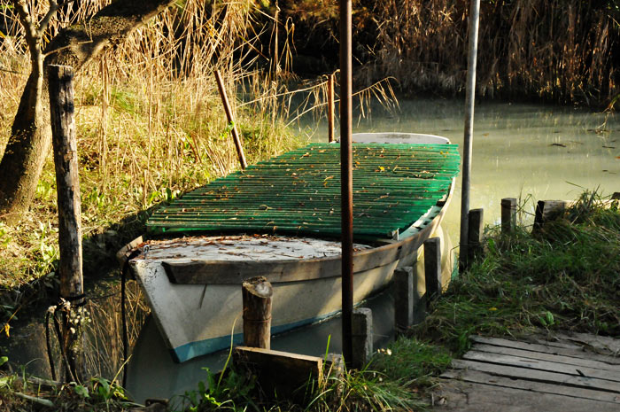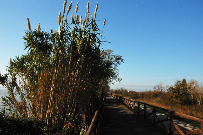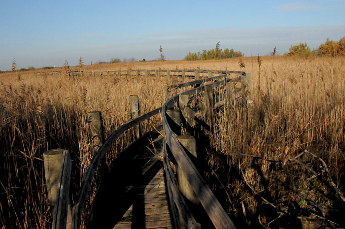 Endlose Schilfgebiete entlang des Biotopo Palude del Fiume Cavana, ein Paradies für Vögel und deren Beobachter. Hier ein Holzsteg, der es den birdwatch-Touristen ermöglicht, trockenen Fußes in das Schilfgebiet hinein zu gelangen.