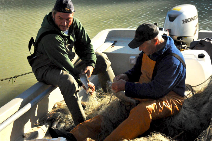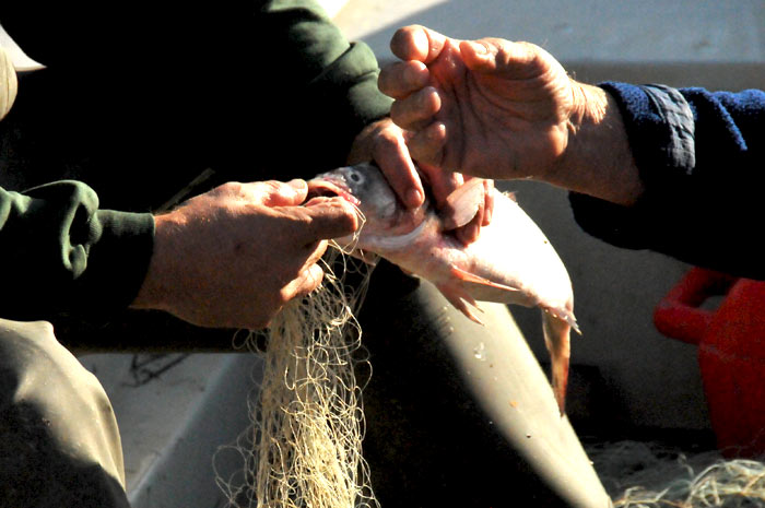Geschickte Hände und viel Geduld sind bei "Befreiung" der Fische aus den engmaschigen Netzen gefragt.