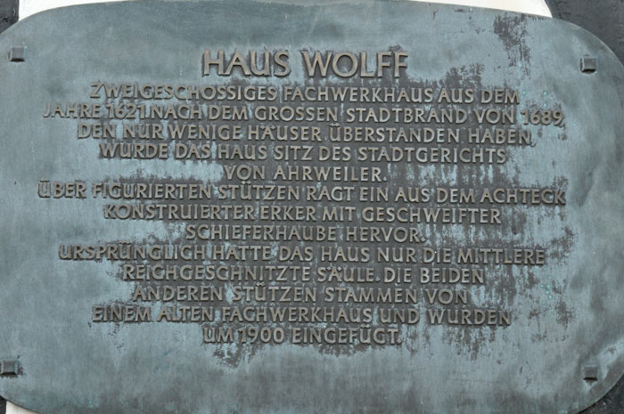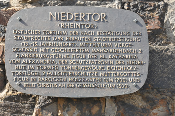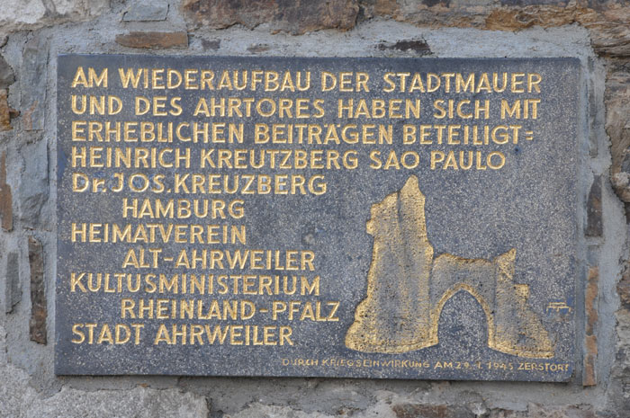 Die Stadtmauer zieht sich kreisförmig um die Stadt und besitzt vier Stadttore. Wir gelangen durch das Ahrtor in die Innenstadt, die weiteren Stadttore sind das Niedertor, das Obertor und das Adenbachtor. Am Ahrtor ist nach Zerstörung im Krieg in moderner Form ein Wehrgang aufgebaut worden, worauf diese Gedenktafel verweist.