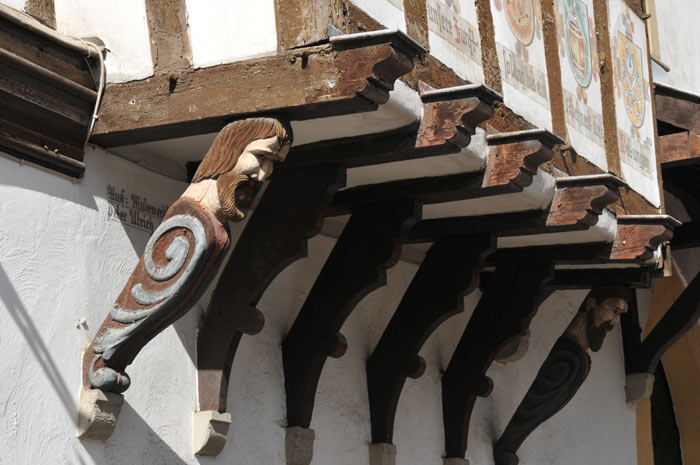 Ein Beispiel, das fast alle Blicke auf sich zieht: Das Haus Wolf mit seinen reich verzierten Stützbalken des Erkers.
