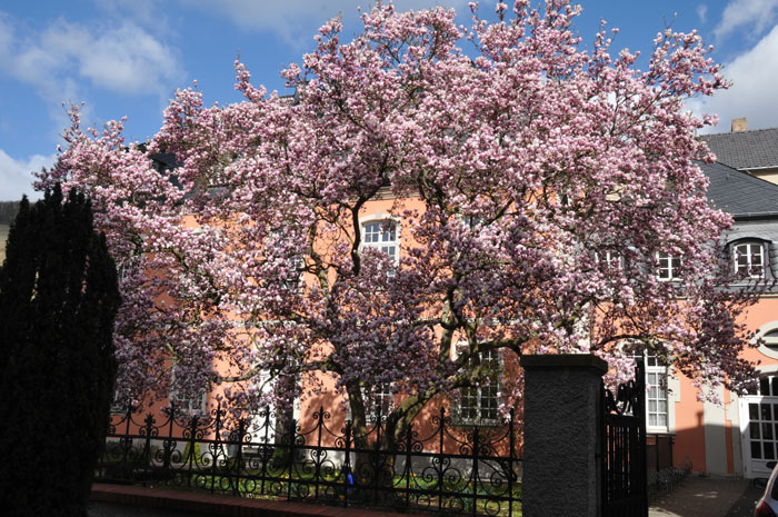 Die Kirche ist von einer Brunnenanlage und bunt blühenden Blumenbeeten umgeben. Gegenüber steht die Stadtwache aus dem ausgehenden 18. Jahrhundert. Uns hatte es der prächtig blühende Magnolienbaum besonders angetan.