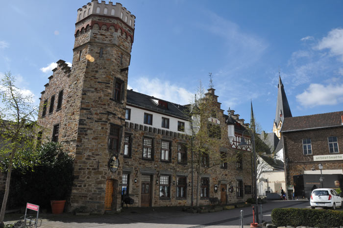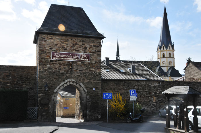 Wenig später erreichten wir bereits das nächste Stadttor, das so genannte Adenbachtor. Unschwer erkennbar, das Ahrweiler ein bekannter Weinort ist, direkt am Stadttor erfolgt bereits der Hinweis auf die Weinprobierstuben (rechts im Bild). Von hier aus gelangt man direkt auf den Rotweinwanderweg. Der Landkreis Ahrweiler ist besonders durch seine hervorragenden Spätburgunder-Rotweine bekannt und ist das nördlichste Weinanbaugebiet in Rheinland-Pfalz.