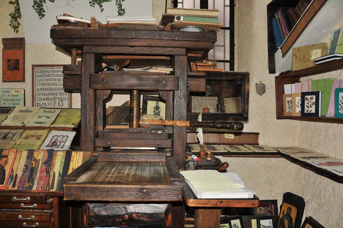 Unterwegs treffen wir in einem kleinen Gebäude auf die Druckereipresse, die zu touristischen Zwecken einzelne Buchseiten druckt.