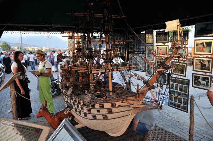 So trafen wir u.a. auf den jungen Mann im Bildhintergrund (mit grüner Latzhose), der sein mittelalterliches Schiffsmodell aus hunderten von hanggefertigten, hölzernen Einzelteilen vorstellte, das in der Zukunft einen eigenen Ausstellungspavillion in Alanya erhalten soll.