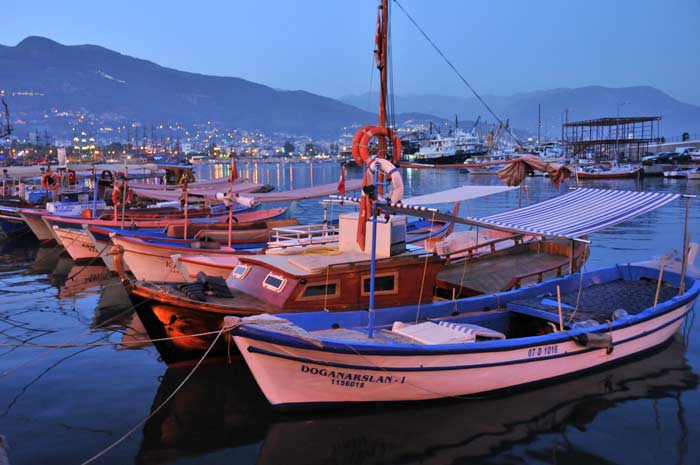 Ein Blick in das alte Hafenbecken von Alanya während der Abenddämmerung.