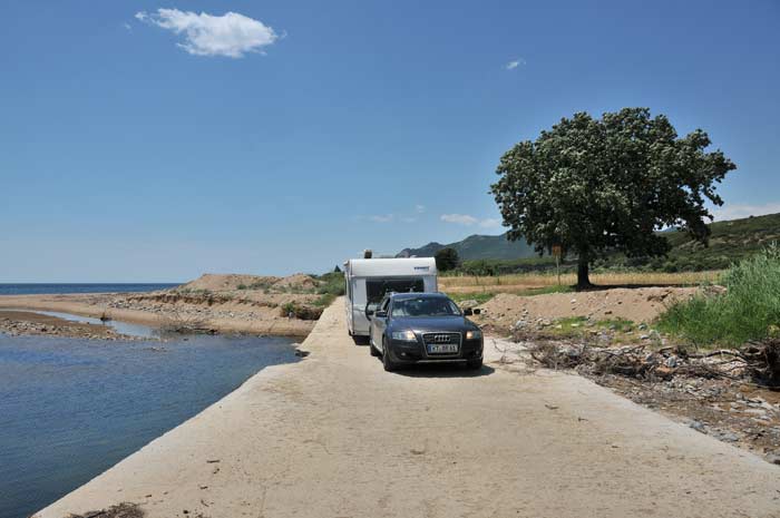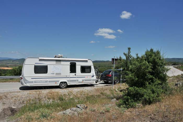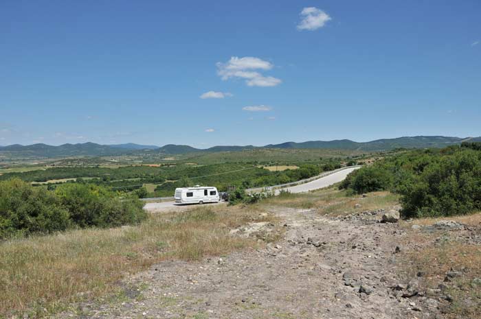 Wenig später waren wir auf der Hauptstraße nach Komotini angelangt und siehe da, es gab Hinweise auf die antike Route der Via Egnatia, der wir dann auch gleich zu Fuß folgten. Im Bild links neben dem Wohnwagen gut zu erkennen.
