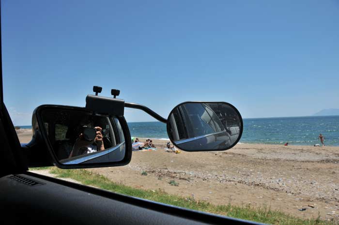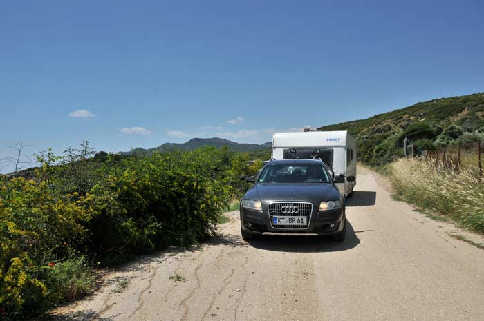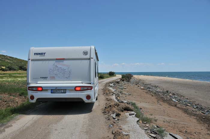 Ausgiebig erkunden werden wir das Gelände während unserer Rückreise im Dezember. Schnell zeigte sich, das die bereits unterwegs angestellten Überlegungen, ob eine Anfahrt mit dem Wohnwagen nach Maroneia sinnvoll sei, sich als richtig heraus stellen sollte. Was zunächst noch als asphaltierte Straße direkt entlang der Küste begann, endete wenig später als steiniger Feldweg, der kaum passierbar war, trotz Markierung in der Karte und im Navi. Von Parken am Straßenrand ganz abgesehen.