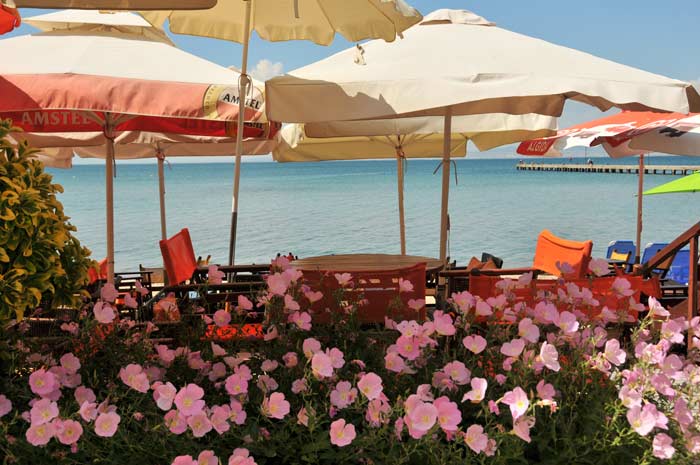 Auch diese Strandidylle gab es an der Uferpromenade: zwei Sonnenschirme ohne Nutzer und weitab von Cafes und Restaurants.