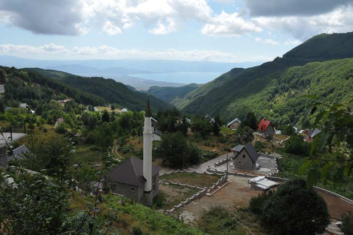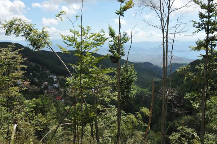 Hier der Blick durch den Ort hindurch auf den Ohridsee, der uns mehrfach als spiegelnde Fläche während des Rundwegs zum Gipfel des Kamen in das Blickfeld geriet.
