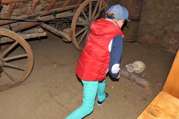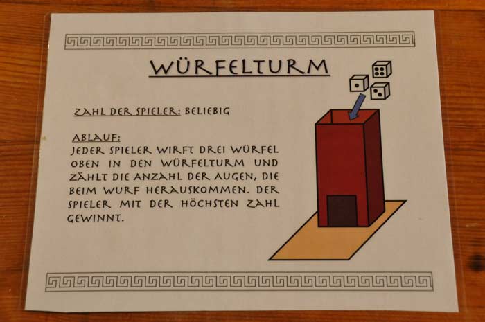 Neben dem Würfelturm gab es das Vorläuferspiel unseres modernen Mühle-Brettspiels, sowie auch ein Geschicklichkeits-Wurfspiel, wobei Walnüsse in den engen Hals einer Amphora geworfen werden müssen.