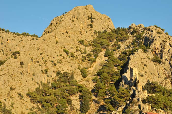 Der Weg in die Stadtmitte führt entlang der Flussmündung, dann über die stark befahrene Brücke über die Cetina und man ist bereits im Stadtzentrum angekommen. Hier ein Blick vom Flusshafen hinauf zur Burganlage ......, die in den Felsen kaum zu erkennen ist.