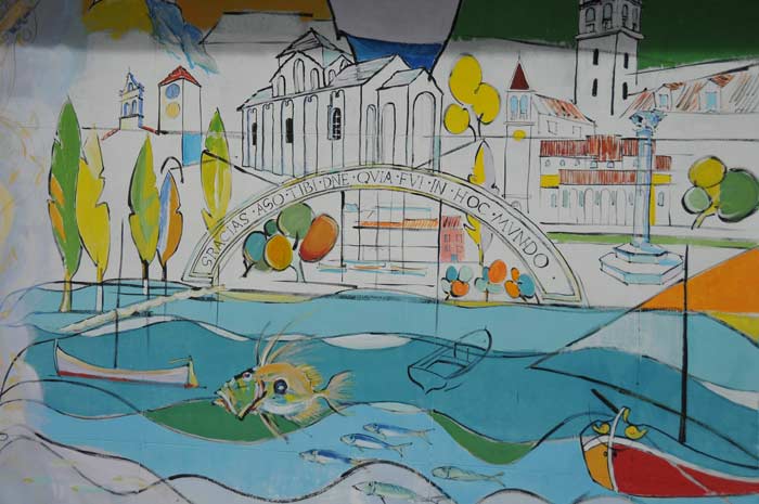 Nach rechts die Hauptstrasse verlassend, gelangen wir in den kleinen Standpark, dessen Ufer auch gleichzeitig öffentlicher Badestrand ist. Im Bild ein Wandgemälde der hiesigen Musikschule, deren Lehrer seit Jahren immer wieder international ausgeschriebene Musikfestivals veranstalten.
