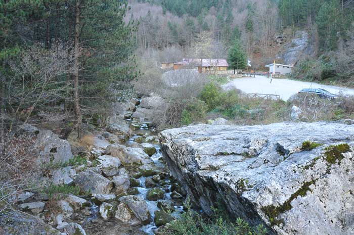 Über diese Brücke endet der Wanderpfad am Bergrestaurant Prionia, der am Ortsausgang von Litochoro beginnt und in etwa 6 Stunden zu bewältigen ist. Rechts des Baches befindet sich der große Parkplatz von Prionia.