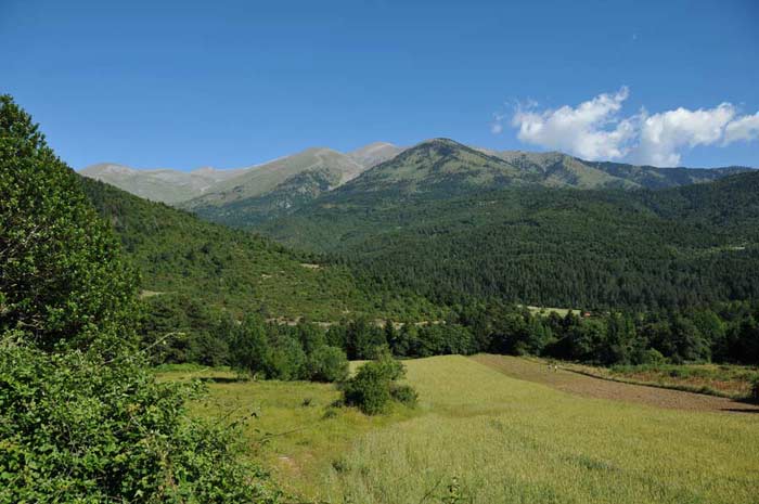 Getreidefelder, von Wäldern umgeben, dahinter die Gipfel des Olymp, die fast 3.000 Meter in die Höhe ragen und noch immer von großen Schneefeldern bedeckt sind.