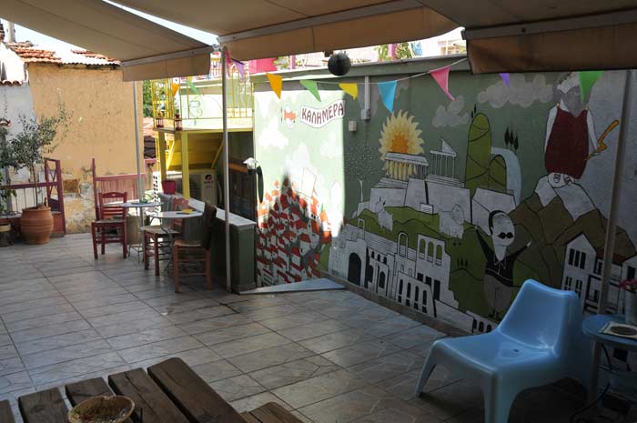 Hier ein kleines Straßencafe mit angeschlossener Pension für Studenten und mit interessanter Wandbemalung an der Gaststube.