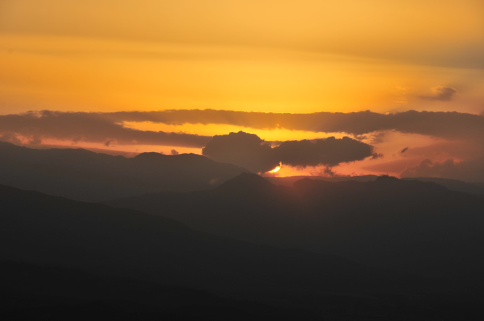 So hatten wir uns bereits am Tag zuvor einen komfortablen Platz gesucht, den hoffentlich spektakulären Sonnenuntergang zwischen den Meteoraklöstern zu beobachten. Die Farbveränderung wird durch die Rayleigh-Streuung verursacht. Die Erdatmosphäre wirkt hierbei mit schwebenden Partikeln, den Aerosolen in der Peplosphäre als diffus streuendes Medium.