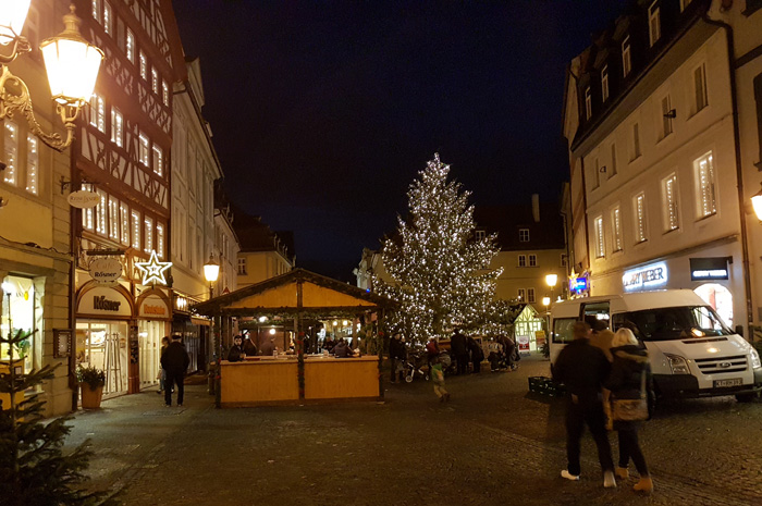 Zur Zeit gibt es zwar schon ein paar Buden Am Markt, die aber noch nicht als Weihnachtsmarkt zu verstehen sind. Zwar gibt es neben den Verkaufsbuden für Glühwein und Punsch auch einen kleinen Eselsstreichelzoo, aber es fehlt doch der Zauber des Weihnachtlichen, was vielleicht auch am fehlenden Schnee liegt.