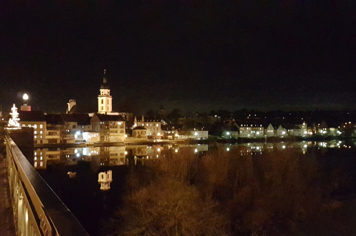 Da der Main fast spiegelglatt dahinfloss, wurden die Häuserfronten im Wasser gespiegelt, ein traumhafter Anblick. Schon in wenigen Tagen ist es in Kitzingen wieder soweit, dass rund um die größte Adventskerze Bayerns, dem angestrahlten Marktturm, sich wieder weihnachtlich geschmückte Buden reihen.