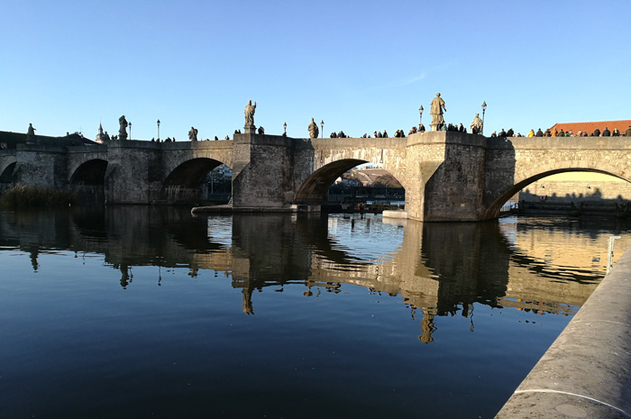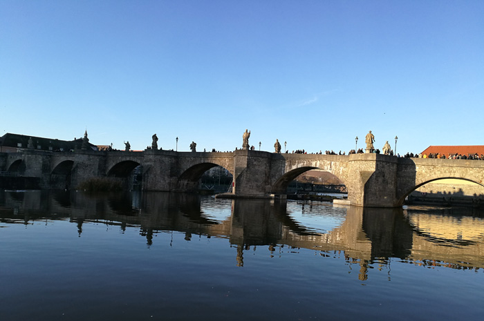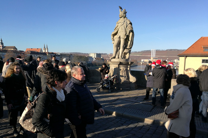 Auf dem Weg zum Weihnachtsmarkt in Würzburg sollte unser Weg zunächst zur alten Mainbrücke führen, der ältesten und bis 1886 sogar Würzburgs einziger Brücke über den Main. Die Brücke verbindet die Altstadt am rechten Mainufer mit der gegenüberliegenden Festung Marienberg.