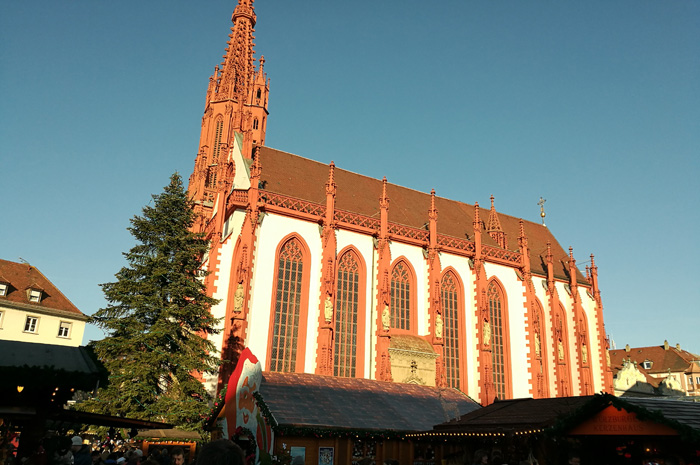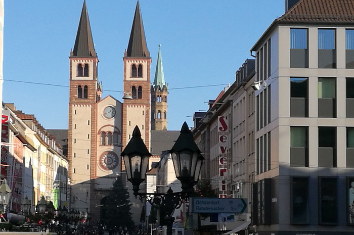 Vor uns liegt der St.-Kilians-Dom zu Würzburg, eine römisch-katholische Kirche, die dem Heiligen Kilian geweiht ist. Der Dom ist die Bischofskirche des Bistums Würzburg. Mit seiner Doppelturmfassade und einer Gesamtlänge von 105 Metern ist er das viertgrößte romanische Kirchengebäude Deutschlands und ein Hauptwerk deutscher Baukunst zur Zeit der salischen Kaiser.