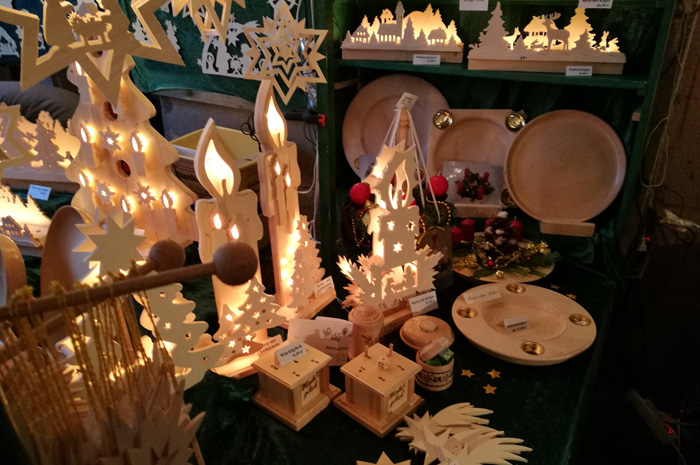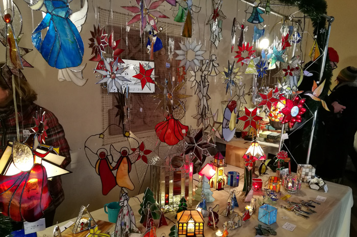 Dort kann man in Ruhe das kunsthandwerkliche Angebot von 30 Künstlern und Handwerkern bestaunen: Silber- und Goldschmuckunikate, selbst gefertigte Christbaumkugeln, Originalölbilder und Aquarelle, Puppen und Puppenkleider, Perlenschmuck, Holzspielzeug, Weidenkörbe, Wollaccessoires und vieles mehr – alles handgefertigt!