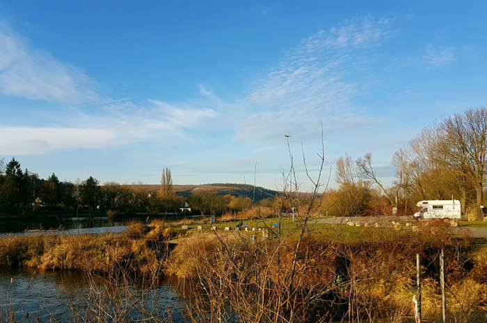 Der Blick hinüber auf den gegenüberliegenden Camperstopp von Mainstockheim zeigte sogar 4 anwesende Wohnmobile auf dem Platz, eine fast winterliche Belebung der Kleinstädte, die der lokalen Wirtschaft zu dieser Jahreszeit bestimmt gut tun wird.