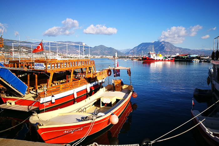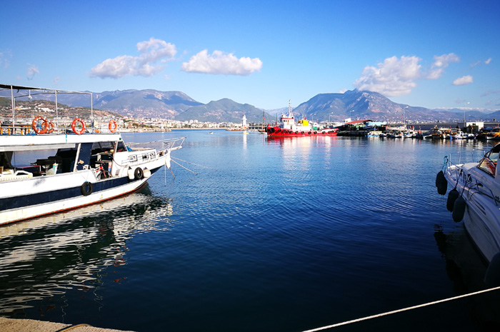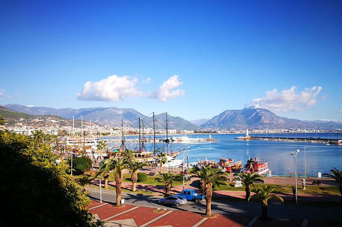 Einmal mehr eröffnet sich ein herrlicher Ausblick auf den Hafen und die Berge im Hinterland, man blickt auf die Stadtteile Oba und Mahmutlar, erkennt aber auch, dass sich nur wenige Besucher in der Stadt befinden.