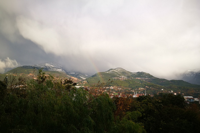 Dann geht es ganz schnell und wir machen uns an den Rückweg, denn der Himmel zieht zu, dichte graue Regen- und Schneewolken ziehen über Alanya hinweg, sorgen für erstes weiß auf den umliegenden Bergen. Da teilweise die Sonne noch in den Wolkenlücken erscheint, bildet sich gar ein Regenbogen.