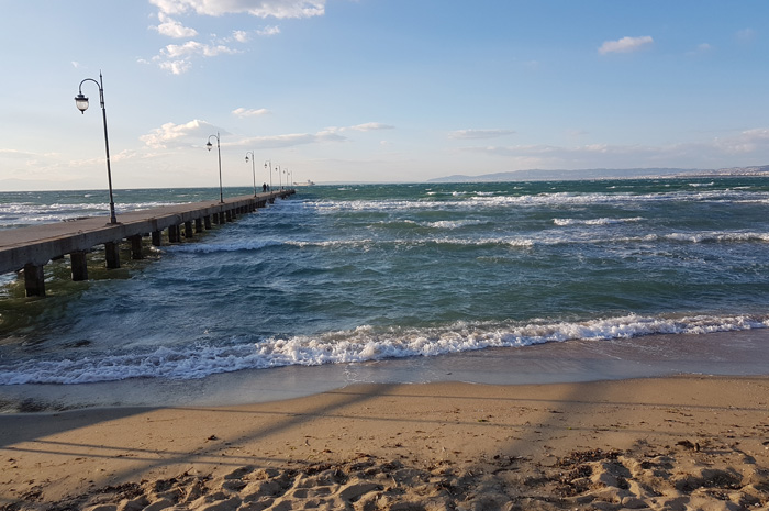 Auf der Pieranlage trotzten zwei Spaziergänger den heftigen Winden, wo ansonsten die Fähre nach Thessaloniki auf ihre Fahrgäste wartet.