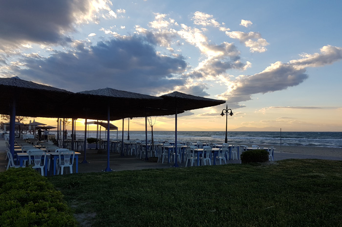 Einige der Strandcafes und Restaurant hatten trotzdem bereits Tischdecken aufgelegt und Stühle und Tische im Strandbereich eingerichtet, die Saison könnte beginnen.