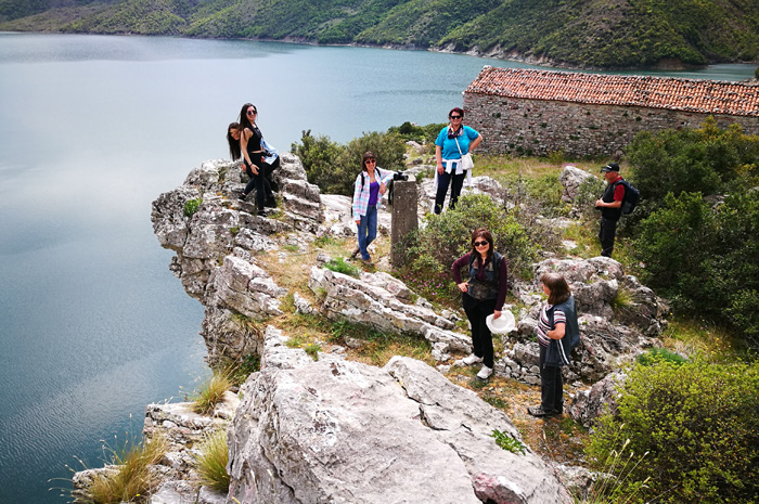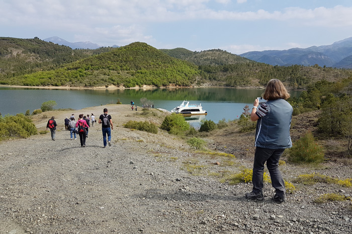 So bestand die Reisegruppe denn auch aus zahlreichen Studenten und uns, den Teilnehmern der teilgeführten Campertour durch Albanien, Mazedonien und Griechenland. Mit dem Bus ging es zunächst bis an das riesige Wasserreservoir heran, bis der Straßenzustand die Weiterfahrt unmöglich machte: ein kurzer Fußmarsch bis zum Boot folgte!