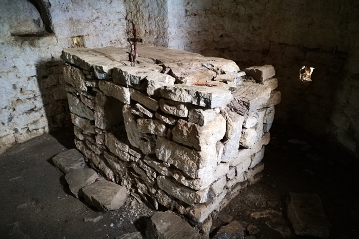 In diesem besonders gut erhaltendem Kirchengebäude finden bis heute noch kirchliche Prozessionen statt, ein Altar aus einfach aufeinander gestapelten Steinen mit kleinem Kruzifix.
