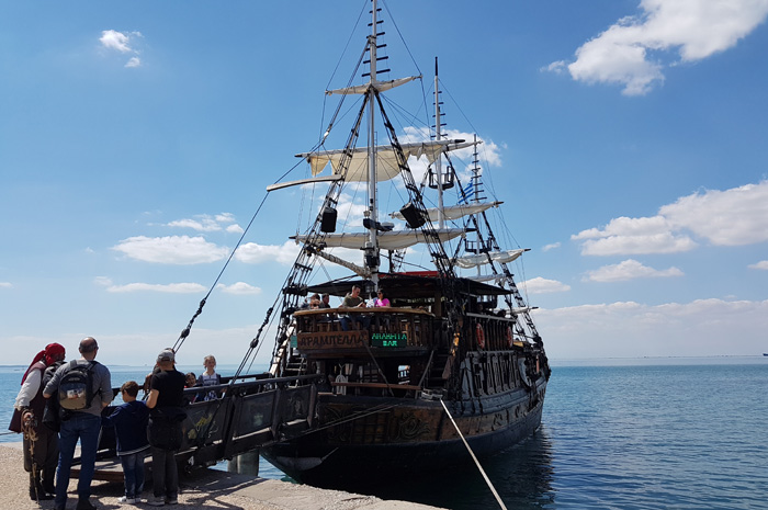 Ein Ausflugssegler im Design eines Piratenschiffs lockte zur Hafenrundfahrt, keine Fahrtkosten, wenn anstatt dessen ein Getränk bestellt wird.