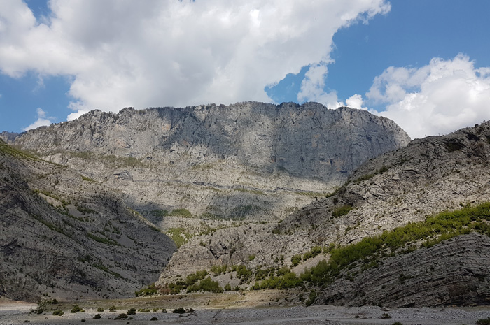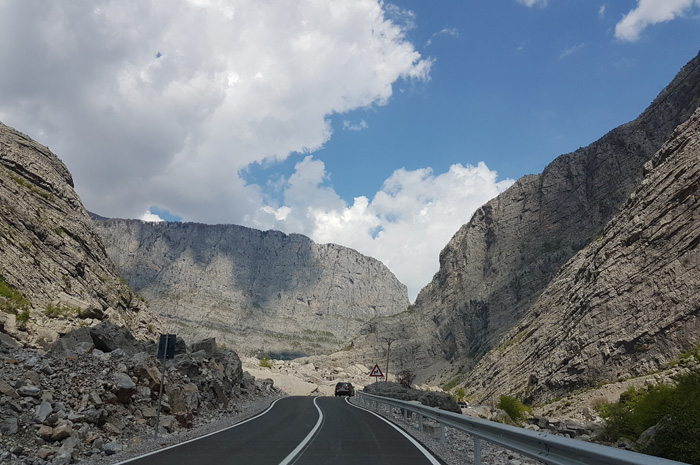 Die rund 70 Kilometer lange Straße von Han i Hotit am Shkodrasee erklimmt einen ersten Pass und windet sich dann in vielen Spitzkehren in die Schlucht des Cem-Tals hinunter, über die wir schon berichtet haben.