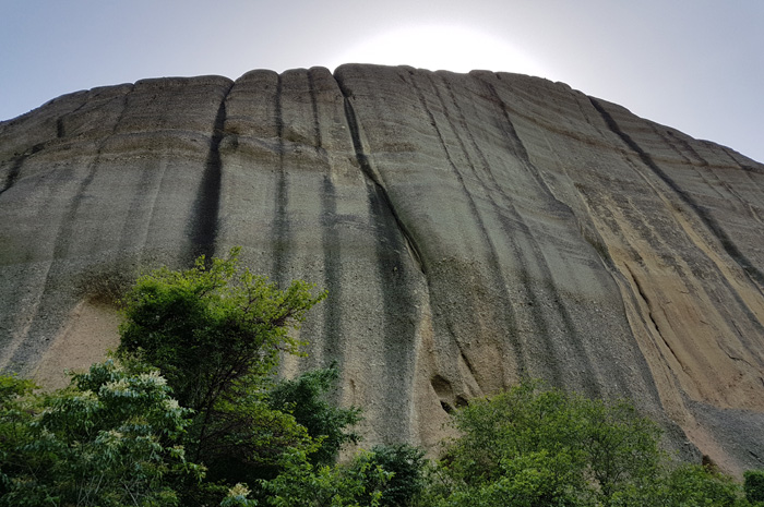 Dann immer wieder der Blick auf die massiven Felswände, die beeindruckend steil bis zu 100 Metern am Weg aufragen.