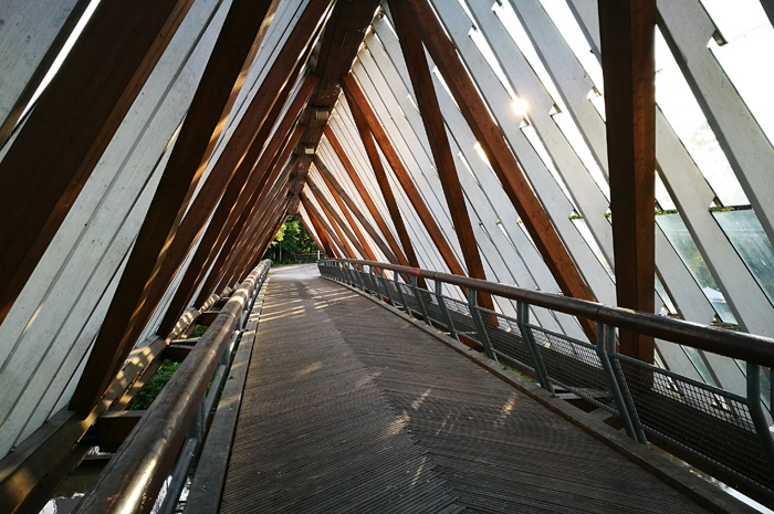 Zwei frei schwebende Holzbrücken überspannen hier den Neckar und die Rems, die zum Zeitpunkt ihres Baus die größten freitragenden Holzbrücken Europas waren.