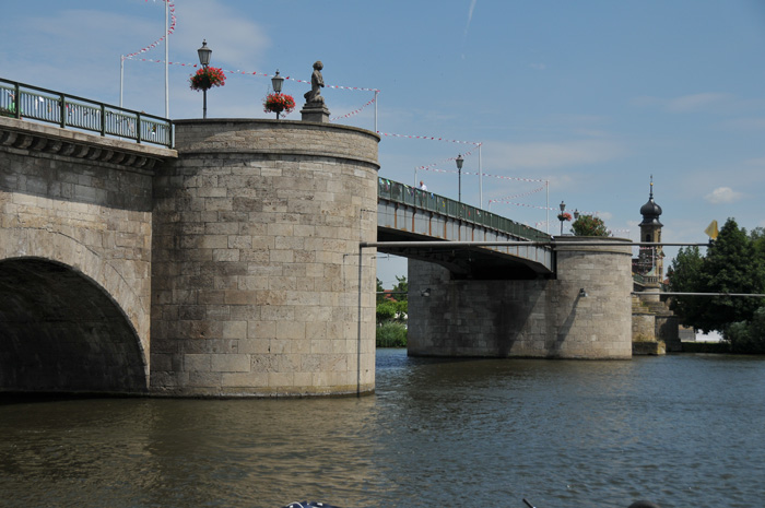 Die erste Konstruktion der alten Mainbrücke stammt aus dem ausgehenden 14. Jahrhundert, um 1955 wurde sie dann umgebaut, um der Schifffahrt auf dem Main mehr Raum zu geben.