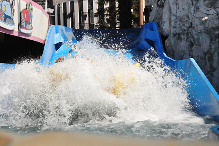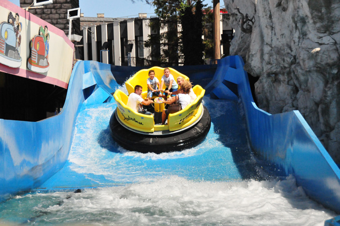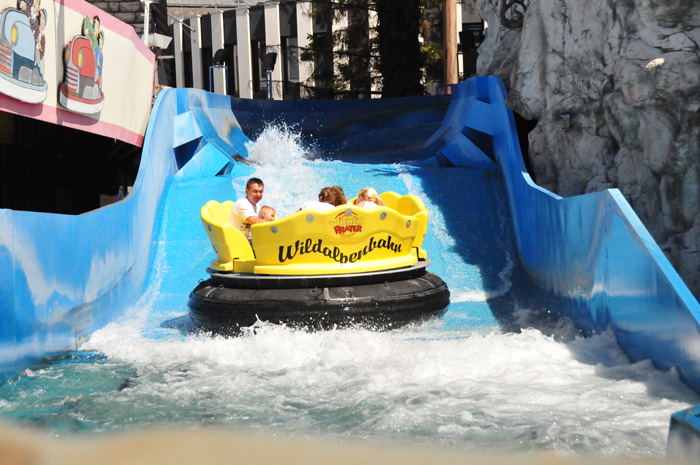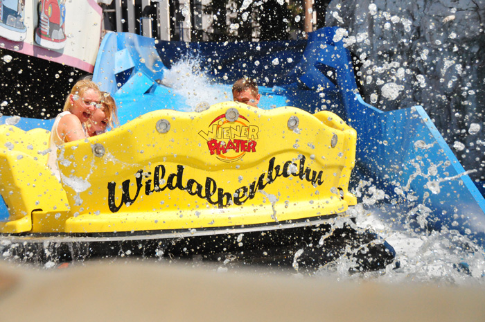 Drei weitere, wenngleich kleinere Wahrzeichen des Praters sind der Calafati, der Watschenmann und der Toboggan. Hier im Wasserkarussel kann man es aushalten.